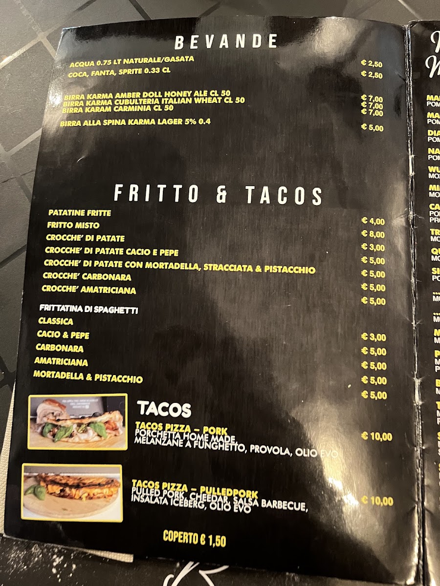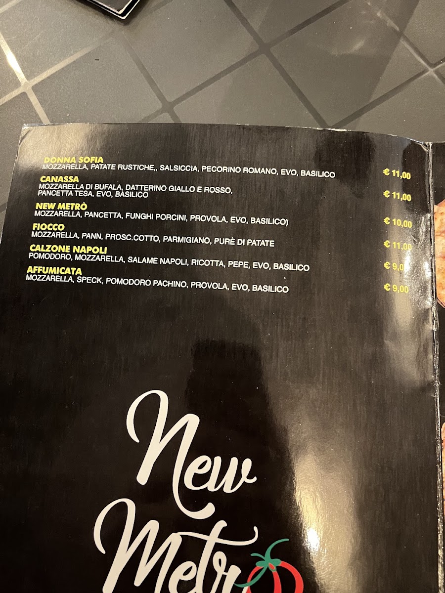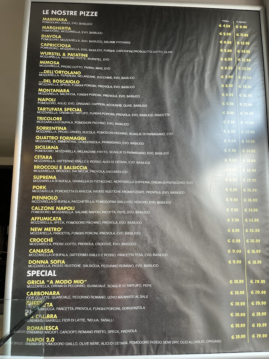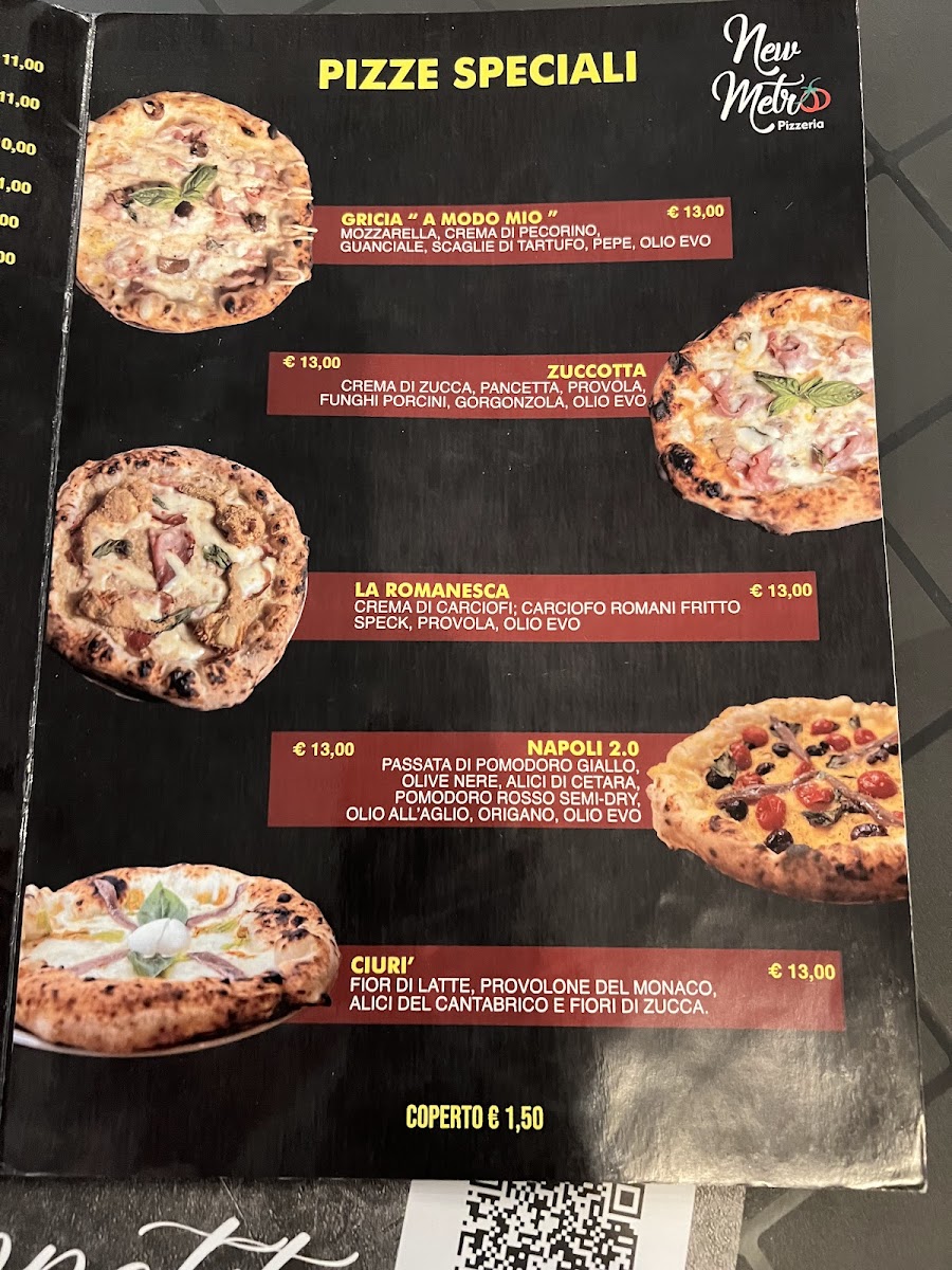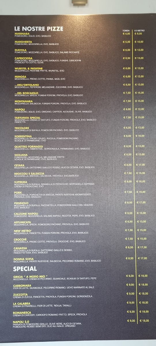 The menu at Pizzeria Rosticceria New Metro’ (Feste E Banchetti) reflects a well-balanced approach to Italian comfort food, where classic recipes and generous combinations define the overall experience. Timeless pizzas such as Margherita and Sorrentina highlight the kitchen’s respect for tradition, focusing on familiar flavors that are clean, aromatic, and satisfying. Folded options like Calzone Napoli add variety and heartiness, while vegetable-forward choices such as L Ortolana bring freshness and balance to the selection. For guests with specific dietary needs, Suprema GF shows thoughtful attention without compromising on taste or structure. More contemporary and indulgent pairings appear in Pizza Mortadella Mozzarella E Pistacchio, where creamy textures and nutty notes create a distinctive profile. The menu also caters well to casual dining and sharing, with comforting sides like Patatine E Wurstel and the richer Patatine E Würstel Metà E Salsiccia E Broccoli, combining crisp potatoes with savory meats and vegetables. Local culinary identity is further reinforced through Tiella Ai Polipi, a dish that stands out for its regional character and depth of flavor. Classic mixed pizzas such as Capricciosa E Quattro Formaggi deliver intensity and richness, appealing to those who enjoy layered toppings and bold cheese notes, while Pizza Tricolore offers a visually appealing and well-rounded option that echoes Italian culinary symbolism. Overall, the menu feels cohesive and versatile, successfully accommodating traditional tastes, modern preferences, and group dining occasions without losing its clear Italian identity.